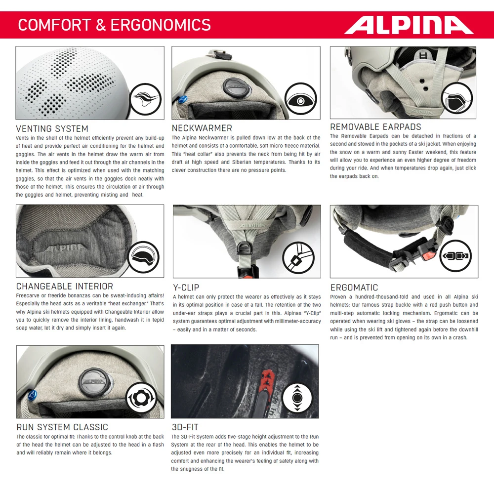 Uniek is het design is het Translation Rotation Mechanism (TRM) waarbij het vizier naadloos aansluit op de helm, zonder ruimte voor tocht. De pasvorm van deze helm is bijzonder prettig en comfortabel dankzij de van Lavalan wol en Microfleece binnenwerk. De schuimstructuur onder de harde ABS buitenschaal is gemaakt van Hi-EPS, waardoor de prettige ventilatie merkbaar is. De lucht wordt actief naar binnen geleid, langs het hoofd geleid en via openingen aan de achterzijde weer naar buiten getransporteerd. Dit voorkomt dat warmte zich ophoopt en een optimaal klimaat gegarandeerd is. Het Alpina Run Systeem Classic zorgt dat de maatvoering zeer precies kan worden gefinetuned aan de individuele vorm van het hoofd. Daarnaast zijn de earpads afneembaar, prettig bij warm weer. Kortom… fijne, comfortabele wintersport helm!