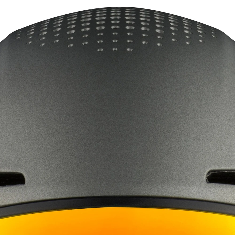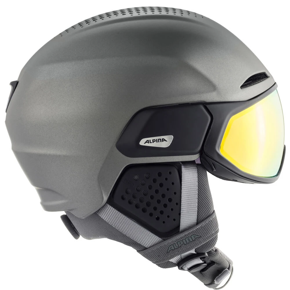 Deze gunmetal-grijze Alpina Oro QV skihelm heeft het QuattroVario meekleurende / Photochromic vizier met ideaal zicht tijdens donker weer en sneeuw tot licht bewolkt weer (Categorie 2-3). Maximaal contrastrijk zicht voorzien van Polariserende en Spiegelende coating. Het vizier wordt automatisch donkerder als er meer licht op valt en biedt altijd 100% bescherming tegen UV-A, UV-B en UV-C-stralen en mede dankzij de spiegelende eigenschappen van dit vizier blokt de spiegelcoating van deze lens ook Infrarode straling. Het vizier is óók voorzien van een Anti-Fog coating dus beslaan is nagenoeg onmogelijk.