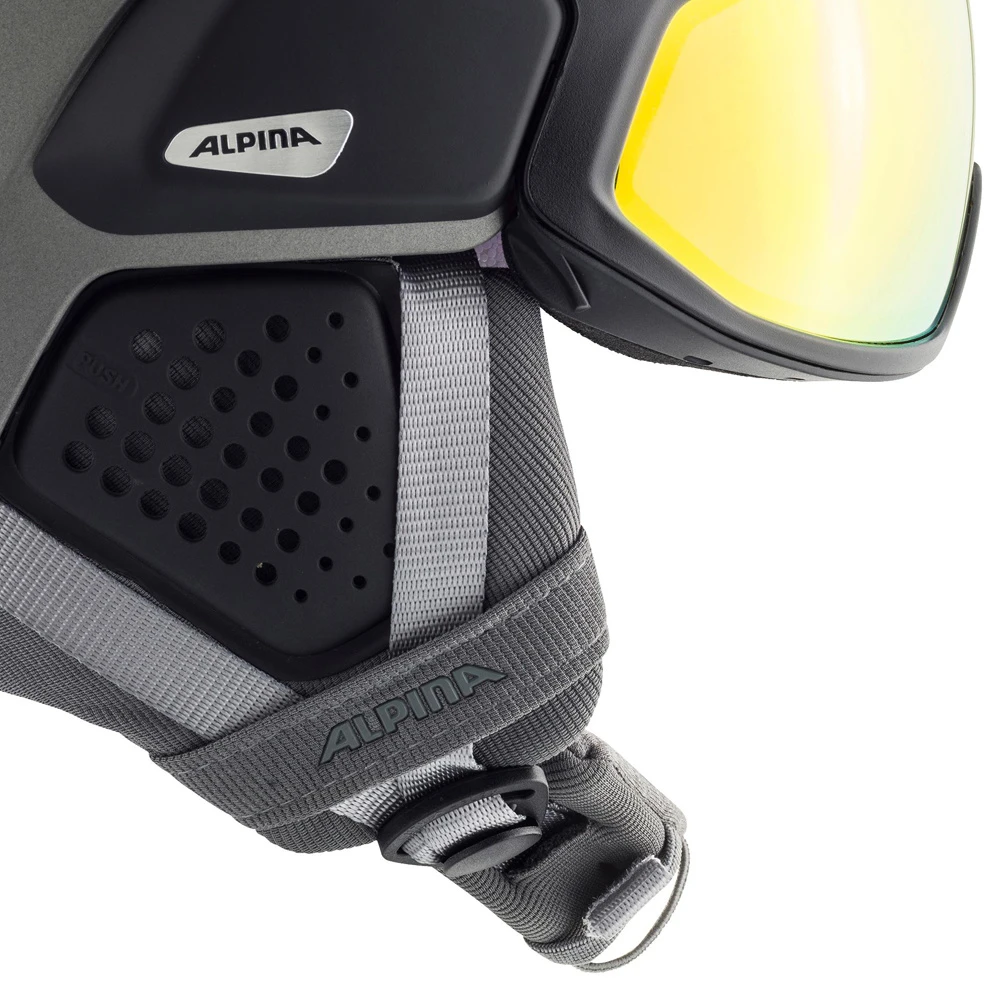 Deze Alpina Oro QV in Gunmetal Matt grijze kleur is eigenlijk de completere uitvoering van de Alto voorzien van MIPS veiligheidsysteem en het meest luxe, meekleurende vizier. Deze stevige, zeer comfortabele skihelm heeft de veilige Hardshell / ABS constructie. Uniek aan deze modellen is het TRM mechanisme dat het vizier naadloos laat aansluiten op de helm. Hierdoor is er geen hinderlijke luchtstroom die je bij veel andere vizier-skihelmen wel hebt. Het luxe Photochromic (meekleurende) vizier is breed en geeft daardoor maximaal zicht en het comfort is erg fijn door de pasvorm maar ook door de met Lavalan schapenwol afgewerkte nekwarmer en binnenstoffering. De hygiëne is goed voor elkaar dankzij het feit dat deze uitneembaar is. De ventilatie is de helm zorgt voor minder vocht in de helm waardoor het dubbelwandige vizier nagenoeg niet kan beslaan. Ook bij warm weer is het zweten aanzienlijk minder wat het comfort nog beter maakt.