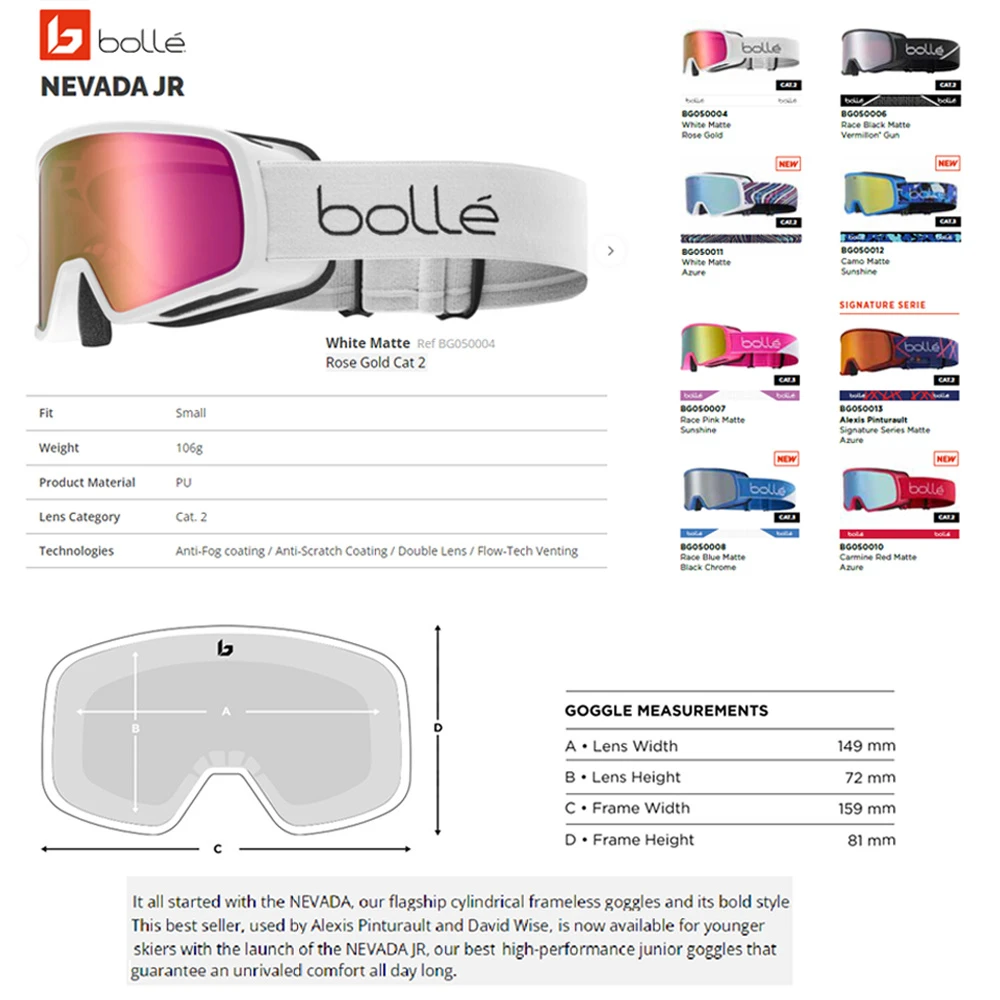 Deze junior versie van de Bollé Nevada ski- en snowboard bril is bedoeld voor kids van 5 tot 12 jaar |(zie afmetingen) en heeft een bijna onzichtbaar frame. Daardoor heeft hij een trendy look waarbij de fijne rood-roze spiegellens en het grote formaat zorgen voor een enorm breed, helder zicht. De lens beschermt altijd maar is optimaal qua zicht bij wisselvallig, bewolkt tot licht zonnig weer. De dubbelwandig lens en de Anti-Fog coating zorgen ervoor dat beslaan of bevriezen van de lens onmogelijk is. Deze cilindrisch gevormde skibril is gemakkelijk verstelbaar en zeer comfortabel. Skibril met topdesign, één van de toppers in dit segment.