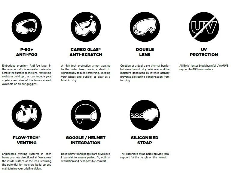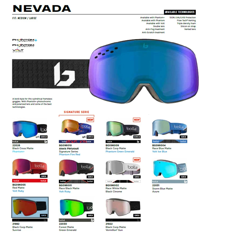 Deze uitvoering van de Bollé Nevada skibril heeft een prettige, Black Chrome categorie 3 spiegellens die een rustig, helder, grijs getint beeld geeft met het beste zicht geeft bij licht bewolkte tot goed zonnige omstandigheden. De bescherming is prima want schadelijk UV licht en Infrarood straling wordt 100% geblokt. Ook dit Bollé model is verkrijgbaar in verschillende prijsklassen doordat hij verkrijgbaar is met verschillende soorten lenzen. U kunt zelf kiezen welke uitvoering met welke lens het best bast bij uw specifieke eisen.