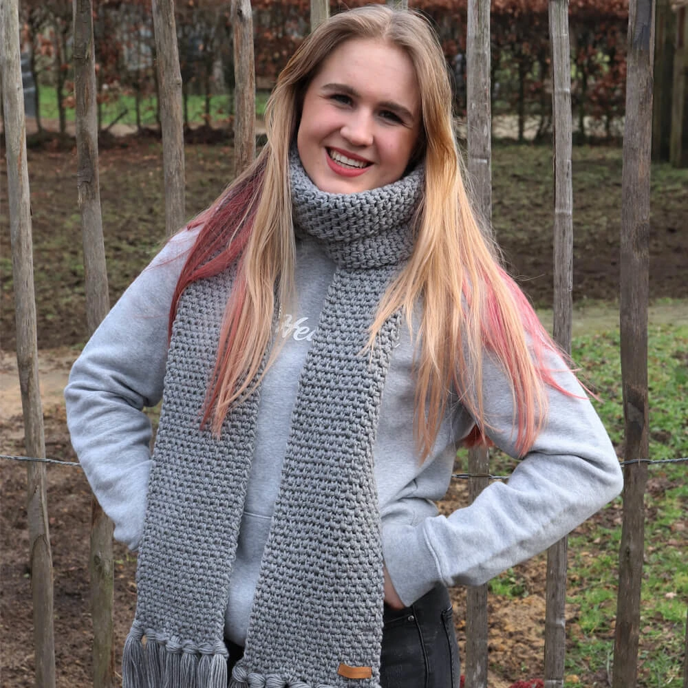 Deze grof gehaakte sjaal / scarf is uitgevoerd in grijze Acrylwol. Dat materiaal is super warm en voelt zeer comfortabel. De uitstraling is stoer en tijdloos.