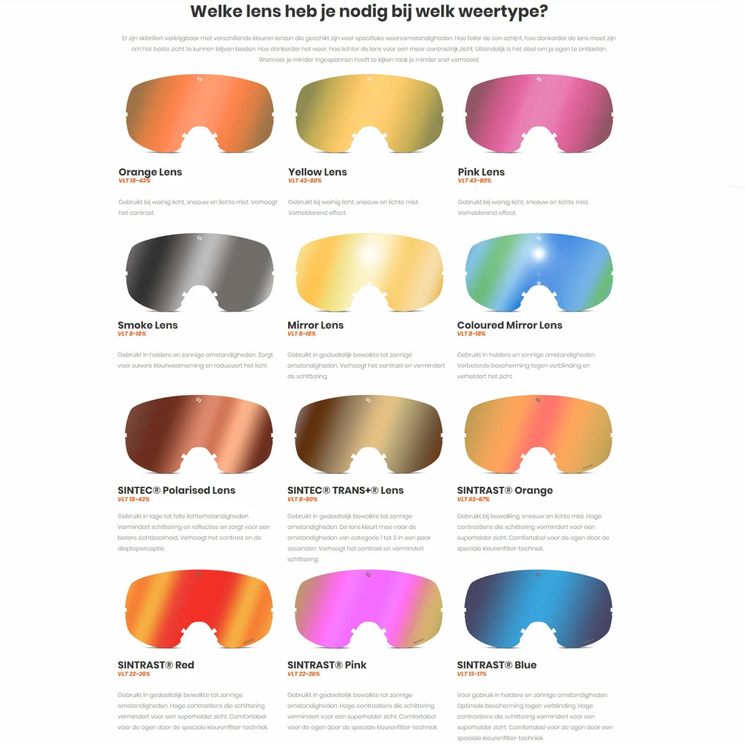 De spiegelende lens van een skibril bepaalt uw zicht en de mate van bescherming van uw ogen die de lens biedt tegen de schadelijke kant van zonlicht (UV-400 bescherming). Deze Sintrast lens zorgt voor een helder, contrastrijk beeld en filtert alle reflectie er keurig uit. Ideaal bij zwaar bewolkt, donker weer tot licht zonnig(Cat.2 ) en blokt 100% UV én Infra-Rood straling.