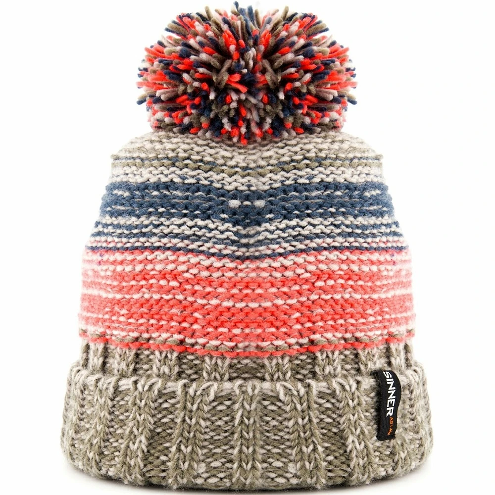 Grof met de hand gebreid, heerlijk warm en gemaakt van heerlijk zacht Acryl, dat is deze veelkleurige Sinner resort kids wintermuts met rode accenten. De binnenkant van deze beanie is v.v. een warme fleece voering. Voorzien van pompom bolletje en Sinner logo.