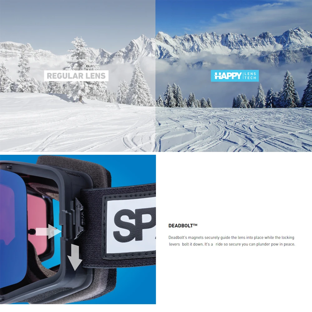 Happy™ Lens Technology van Spy+ is ontworpen om kleuren te versterken en veranderingen in het terrein te benadrukken, terwijl het humeur en de alertheid worden verhoogd voor een game-changing sneeuw ervaring. Deze spiegellenzen dekken nagenoeg ieder weertype af wat de bril geschikt maakt van donker, sneeuwerig weer tot volle zon. De dubbel-laags lenstechniek zorgt ervoor dat de lens niet bevriest en nauwelijks kan beslaan. De spiegelcoating op deze lens ziet er cool uit en belangrijker nog, hij blokt alle schadelijke UV. Het magnetische wisselsysteem laat u binnen enkele seconden wisselen van lichte naar donkere lens en terug als het weer omslaat.